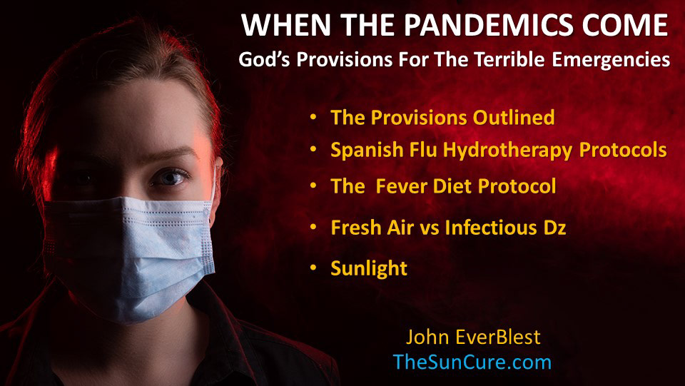 DESCRIPTION: The 1918 Spanish influenza pandemic (H1N1 Swine flu) has been described as "the greatest medical holocaust in history”. It had 4 waves, lasted 15 months, killed an estimated 17-100 million worldwide(4) with a global mortality rate estimated at 10-20% of those infected.(1) Yet there were some medical institutions that had far fewer deaths than others, some approaching nearly a 100% recovery rate, like The Battle Creek Sanitarium.(2)(3) The institutions with the greatest success in treating infectious diseases were those that used God’s simple hygienic methods for both prevention and treatment. Their protocols are laid out here. God has made provisions for the terrible emergencies, and these provisions are available to us all. Our latest pandemic was the warning shot across the bow to awaken us into preparing for what's really coming for us.